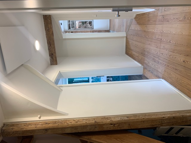 Obwohl pro Stock extrem wenig Quadratmeter zur Verfügung standen, erlebt man in dieser Wohnung durch geschickte Blickbezüge und unkonventionelle Raumöffnungen eine ungeahnte Grosszügigkeit.Die Bühne darf zwar wie so oft nicht als Wohnraum gelten, bringt aber trotzdem durch ein paar gelungene Interventionen den entscheidenden Kick an Wohnspass und Licht.