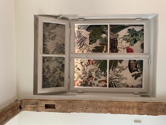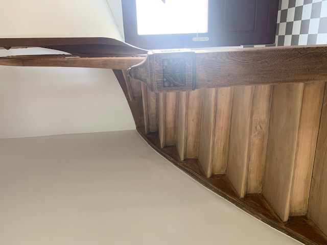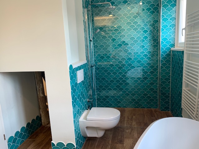 Wärmedämmverbundsystem trifft altes Gemäuer.Das Dach wurde neu isoliert und die Dachbalken einfach abgebürstet und in den Wohnraum integriert.Naturholzdielen längs verlegt und immer wichtig: Gute Beleuchtung.Alt und Neu kombinieren ist stets eine gute Wahl, will man charmante Ergebnisse erzielen. Hier kommt eine alte Kommode als Absturzsicherung zum Einsatz.Der Flur mit erhaltenem alten Dielenboden und vielen Details wie sichtbaren Fachwerkträgern.Das Badezimmer besticht nicht nur durch eine freistehende Wanne und eine bodenebene Dusche, sondern vorallem durch seine mutigen türkisen Fischschuppenfliesen.Sogar Platz für eine bodenebene Dusche ist gefunden. Unter der Treppe ins Dach hat der Waschtrockner Platz. Die Fliesen immitieren übrigens dunkle Holzbodendielen. Ich hätte nie gedacht, das ich das einmal einsetzen werde, aber es war einfach passend zu dem alten Haus.Auch hier wieder: Altes erhalten (Boden) und neues hinzufügen (passendes Licht).Hinter der alten Fassade erschien plötzlich ein altes Fenster. Das haben wir erhalten und mit einer beleuchteten Tapete zum Hingucker auserkoren.Die Küche ist fast fertig, grossflächige Betonfliesen treffen auf den alten Dielenboden.Das alte Treppenhaus wurde nur abgeschliffen und geölt. Herrlich!