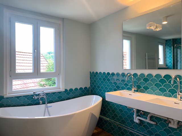 Die vorhandenen Bäder wurden perfekt uminszeniert, so dass ein Maximum an Bewegungsmöglichkeit in den kleinen Bädern geschaffen wurde. Logisch: Bei so einem Blick ist klar, in welche Richtung in Zukunft Zähne geputzt wird!