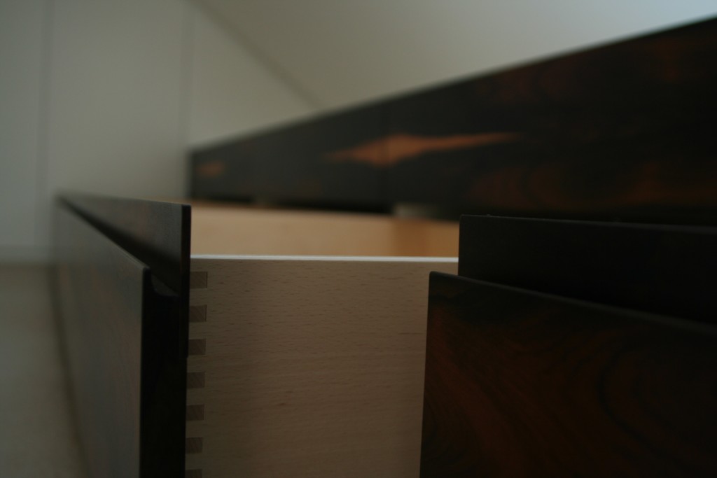 Detail: Die Ziricote Front ist durchlaufend, die Innenschubladen aus massiver Buche.