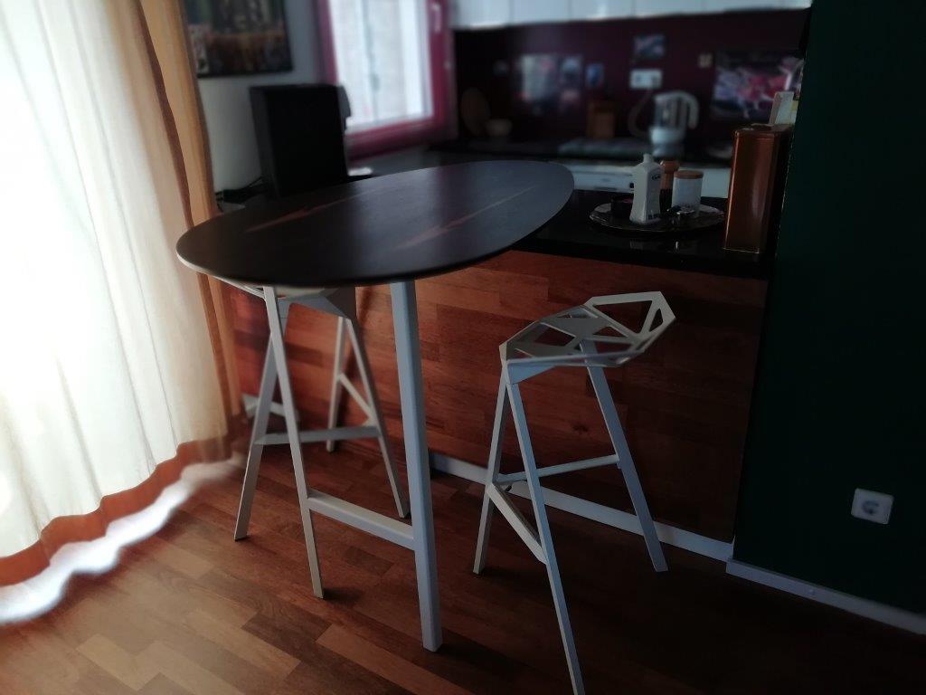 Hier ging es um einen perfekten Sitzplatz in einer kleinen Wohnung. Ein eiförmiger Tisch in Schokoladenbaum mit Tischbeinen, die passend zu den Barhockern geschweisst und weiss pulverbeschichtet wurden.