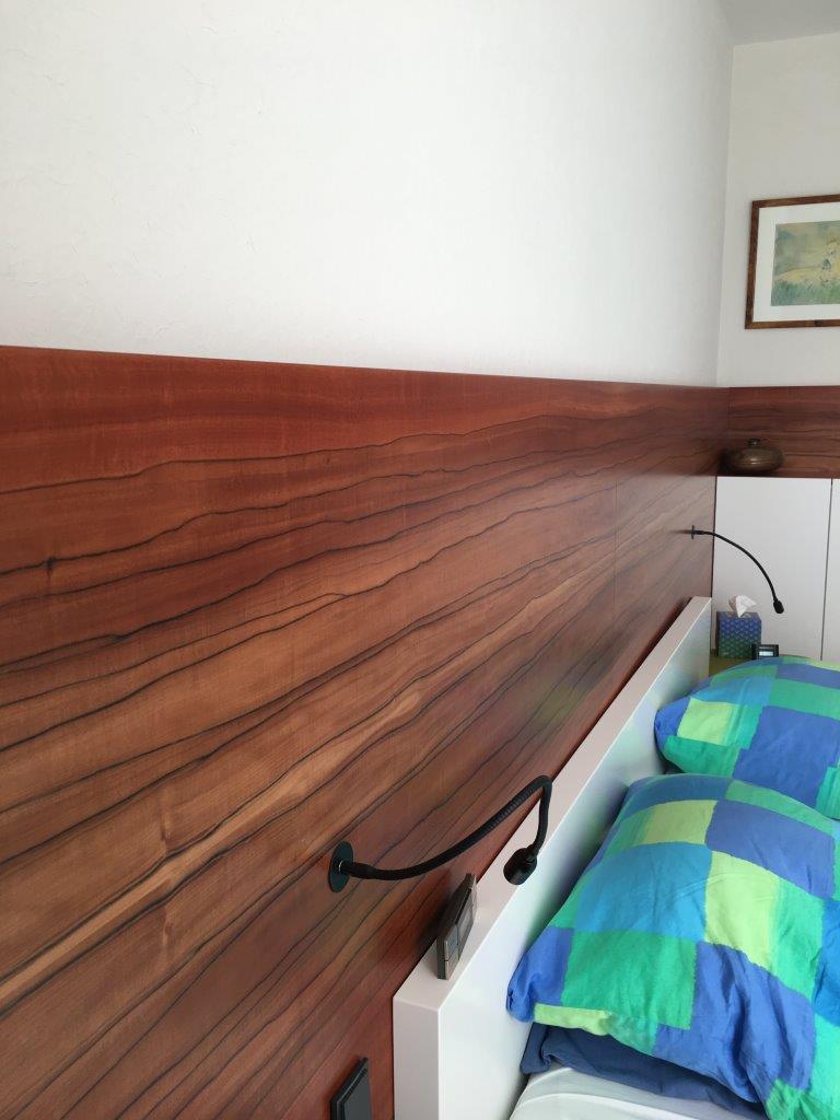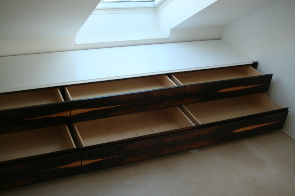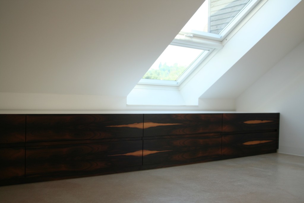 Giebelhoher Schrank und ein niedriger Kniestock. Die Einbauten für ein Dachgeschoss kan man einfach nicht von der Stange nehmen.  Schauen Sie mal, wie geheimnisvoll das Holz Ziricote hier aussieht, es changiert in dunkelbraunen Tönen, ich nenne das Holz auch Schokoladenbaum, obwohl es mit der Schokoladenbohne an sich nichts zu tun hat.