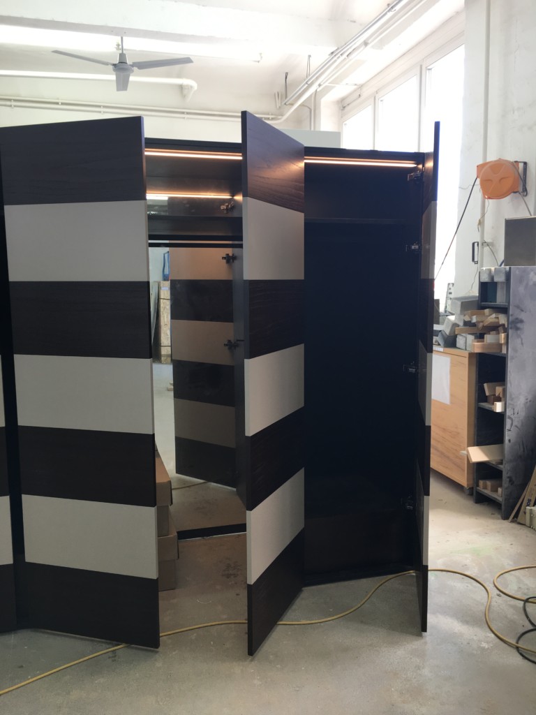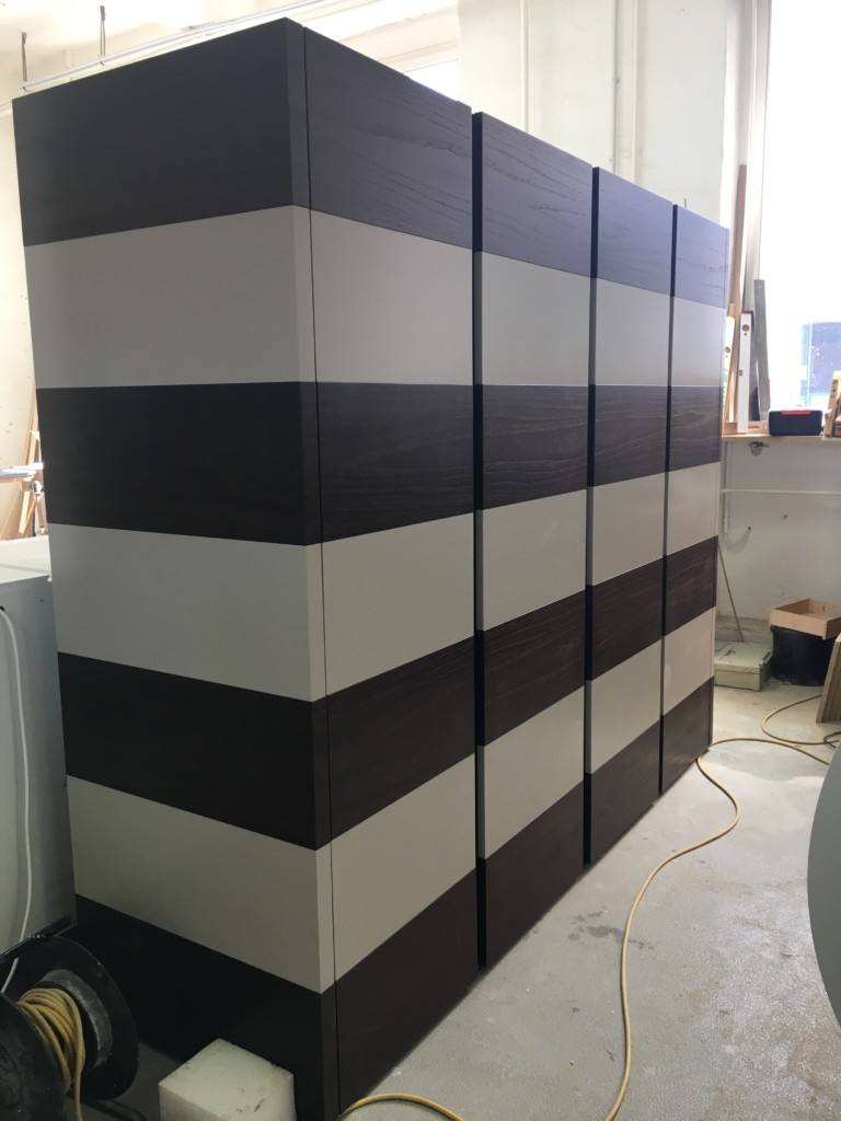 Individuelles Garderobenmöbel mit gestreifter Front.