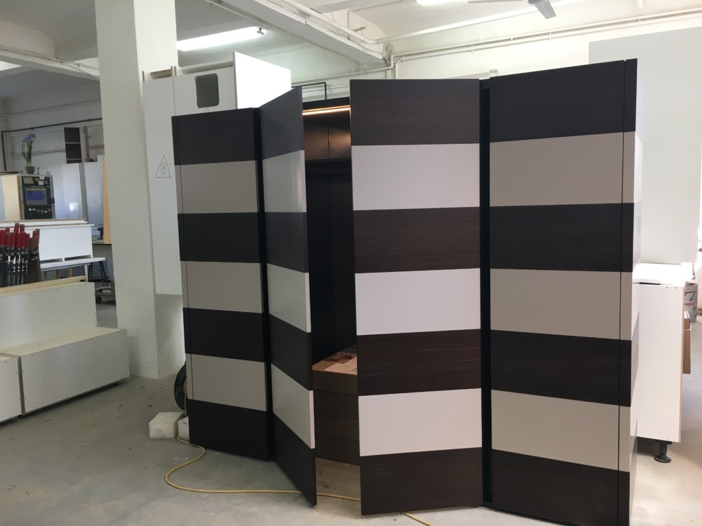 Zebraartig empfängt einen dieses individuelle Schreinermöbel.