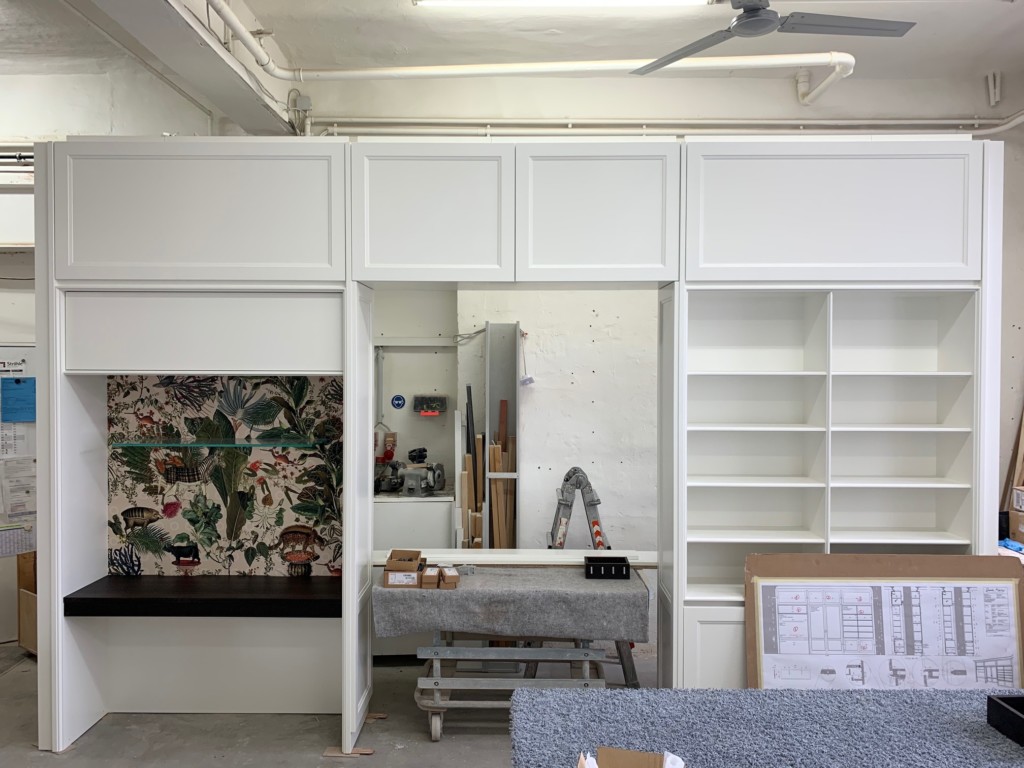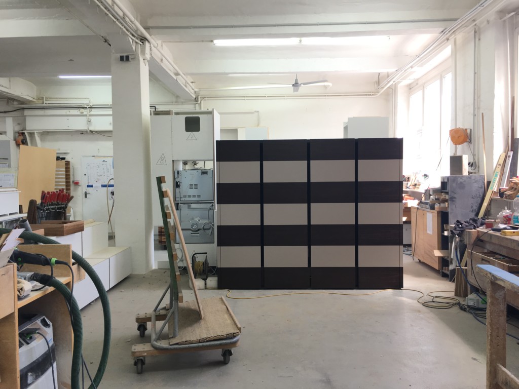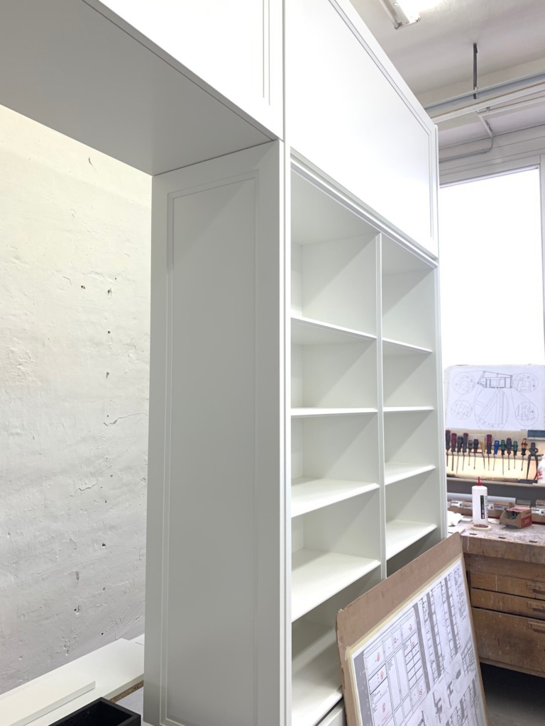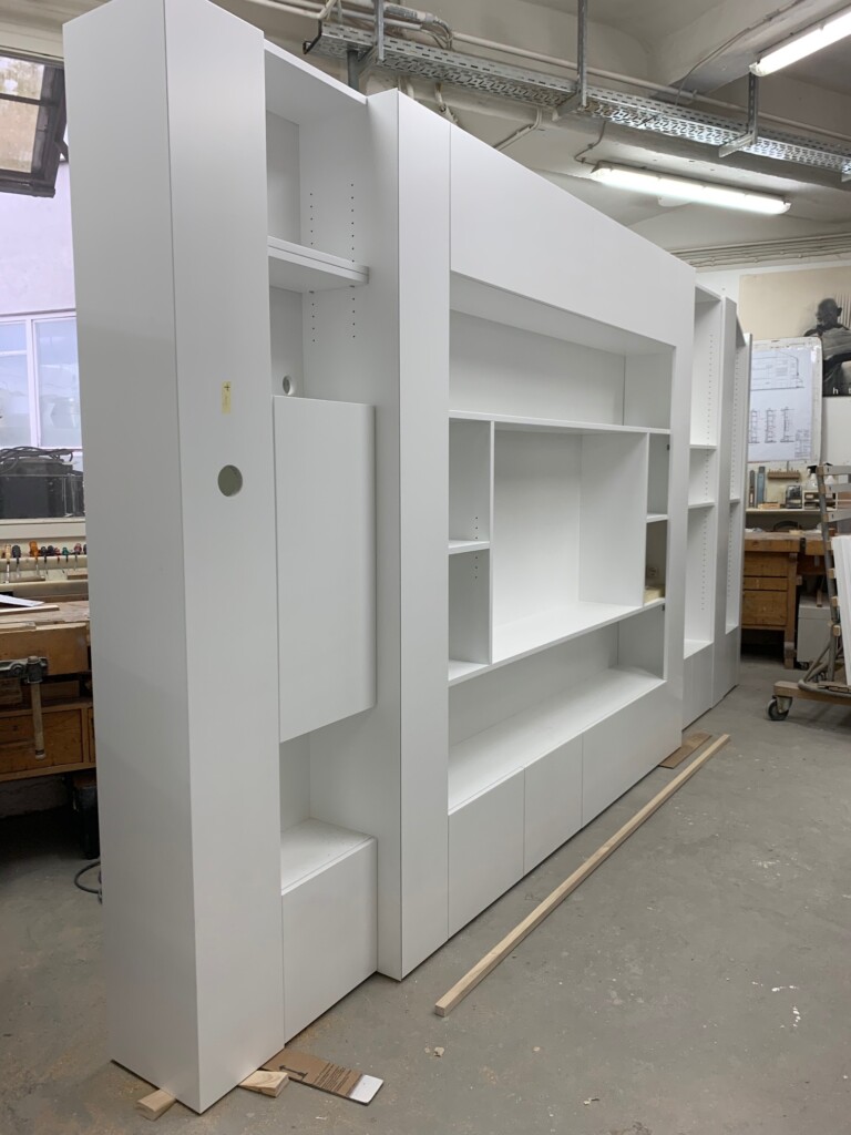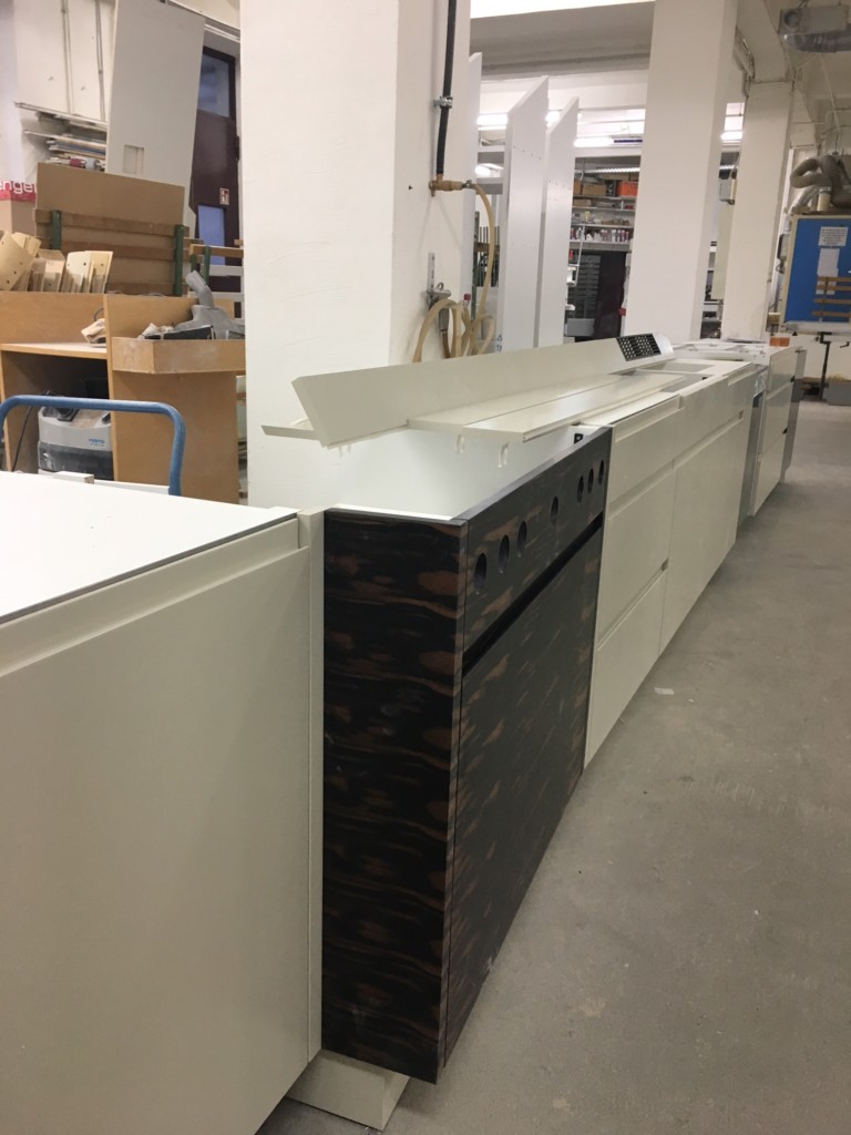 Im Stauraummöbel, das später dem Tisch gegenüber stehen wird, gibt es viel Platz: Tiefe bodennahe Schubladen für Geschenkpapier und andere lange Dinge, Türen hinter denen es wild aussehen darf, und offene Fachböden, für die schönen Buchrücken. Diese Möbel hat übrigens unsere Frau Nindl nach Entwürfen von Sarah Maier konzipiert und konstruiert. Vier Schreiner haben Hand angelegt. Bevor es unsere Werkstatt verläßt schauen wir uns alle Details genau an und prüfen die Qualität der handgeschliffenen Oberfläche.