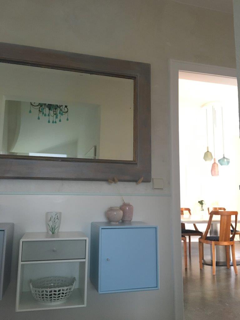 Schon vom Flur aus zeigt das neue Ensemble seine Wirkung. Den Bereich oberhalb der Wandleiste haben wir einfach von der Tapete befreit und roh gelassen. Passt wunderbar zum Charme des Hauses…