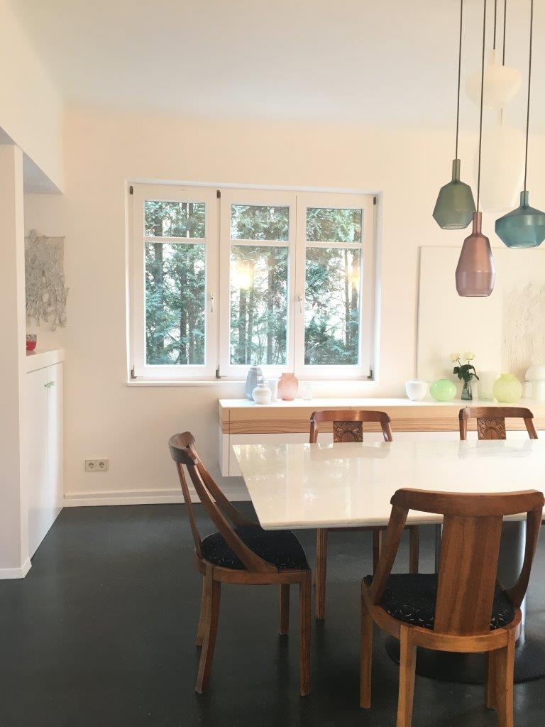 Eine wunderschöne Gesamtintervention in Wohn- und Esszimmer unterstrich den Stil der Kunden bis ins letzte Detail: Die vorhandenen Glaskunstwerke, historische Stühle, ein schwerer Esstisch aus Marmor und die bereits existierende Sofamöblierung wurden durch uns komplementiert: