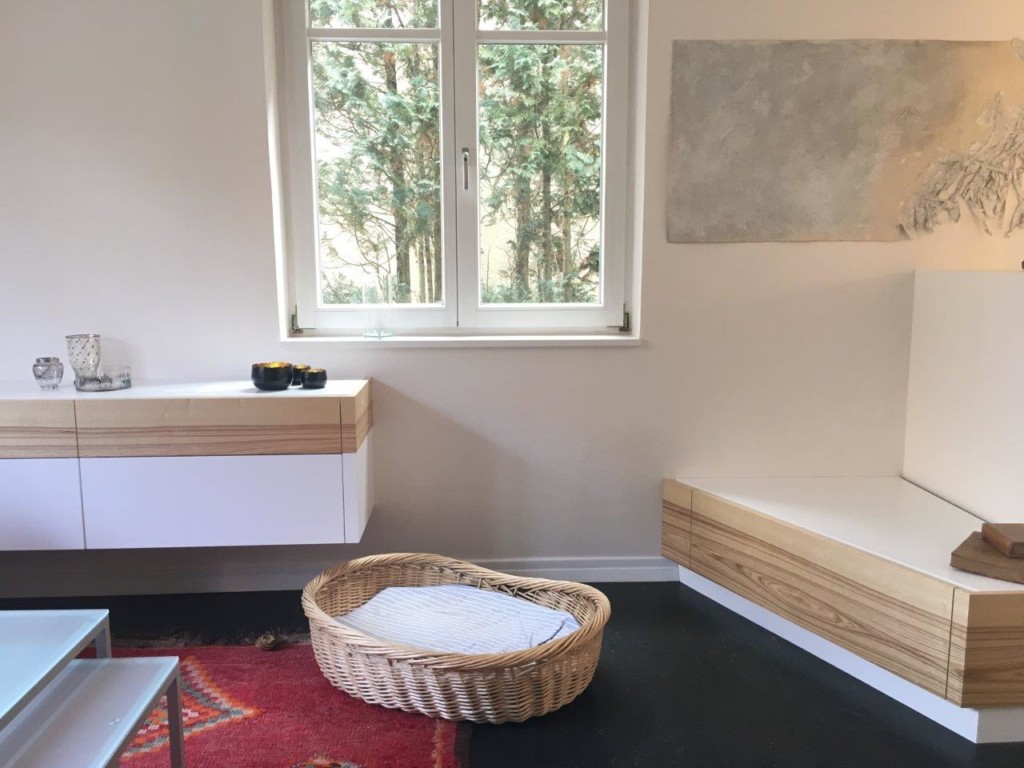 Drei Möbel aus Furnierpartitur (weisser Lack und ein Olivesche-Streifen) verbinden Wohn- und Essbereich. Für den TV wurde ein stauraumoptimiertes Lowboard entworfen (auf den Fotos fehlt der Bildschirm noch). Die Möblierung wurde einfach frech halb unter die Fenster montiert. Und auch für den Hund ist von Anfang an ausreichend Platz eingeplant worden.