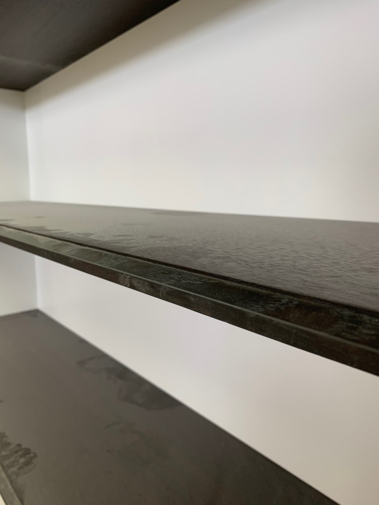 aussergewöhnliche Regalböden aus Wenge, keine normale Kante.