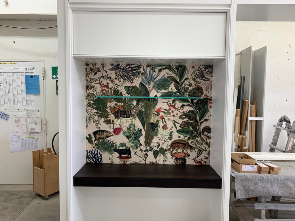 Der Sekretär schiebt sich ein ein weisses Biliotheksmöbel hinein. Die Tapete ist von Moooi und zeigt ausgestorbene Tiere.