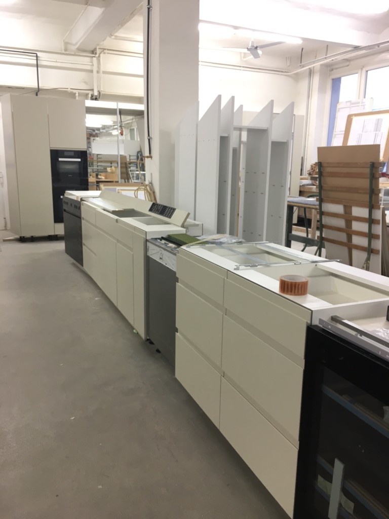 So sieht eine Küche in unserer Werkstatt vor Ihrem Einbau beim Kunden aus. Wir bauen alles haargenau vorab auf, um später ein Fugenmaß von 2mm abliefern zu können. Das wäre eine Küche in L Form. Aber bei uns ist L nicht gleich L…