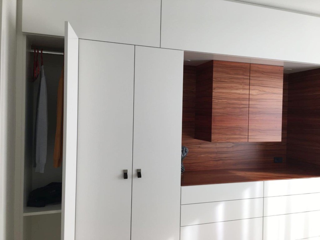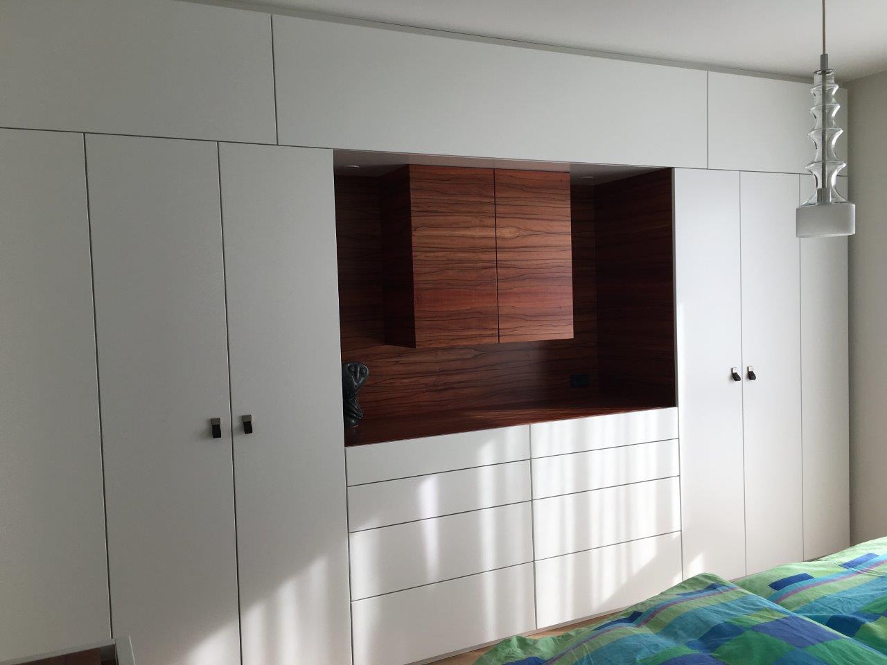 Herausgekommen ist ein perfekt proportionierter Schrank mit Ablage für das Kofferpacken und Wäsche falten, Schubladen, Accessoireschrank und bestens ausgenutztem Stauraum zur Decke hin.