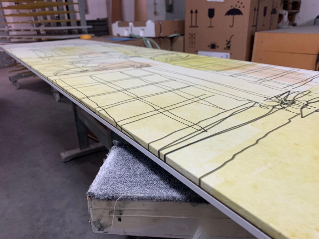 Diese Küche wird ein Raumwunder. Aussergewöhnlich auch die Farbstellung. Die asymmetrischen Teile bekamen ein sanftes braun, passend zum Sassafras auf der Furnierfront. Wir freuen uns alle bis das Meisterstück eingebaut ist. Die Planung dauerte mehrere Monate. Jetzt wird die Küche perfekt nach Terminplan eingebaut. Wichtig zu wissen: Kommt eine Steinplatte vom Steinmetz, dauert dies nochmal 10 Tage nach unserem Einbau, da diese Platten perfekt mit Schablone eingemessen werden und erst danach angefertigt. Toleranz <1mm!