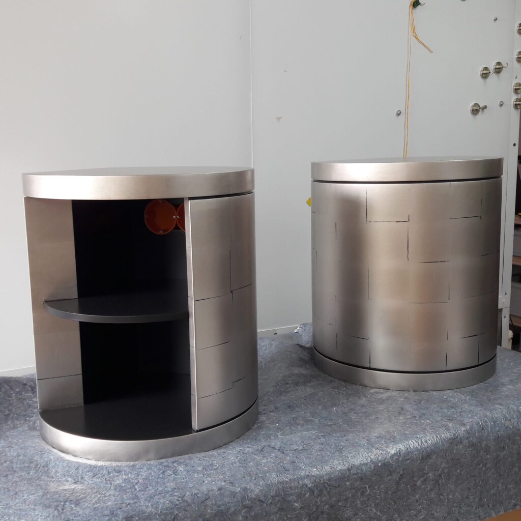 Das ist nur ein klitzekleiner Einblick in ein riesengrosses, wunderbares Projekt, das wir dieser Tage fertiggestellt haben: runde Nachttische, flexibel von unten verkabelt. Auf den von uns schwarz lackierten Untergrund hat eine begnadete Vergolderin (dieVergolderin.de) eine Platinoberfläche angebracht. Abgerundet wird das Ganze dann noch mit aussergewöhnlichen Lichtschaltern, aber die sehen Sie erst wenn es fertig ist!