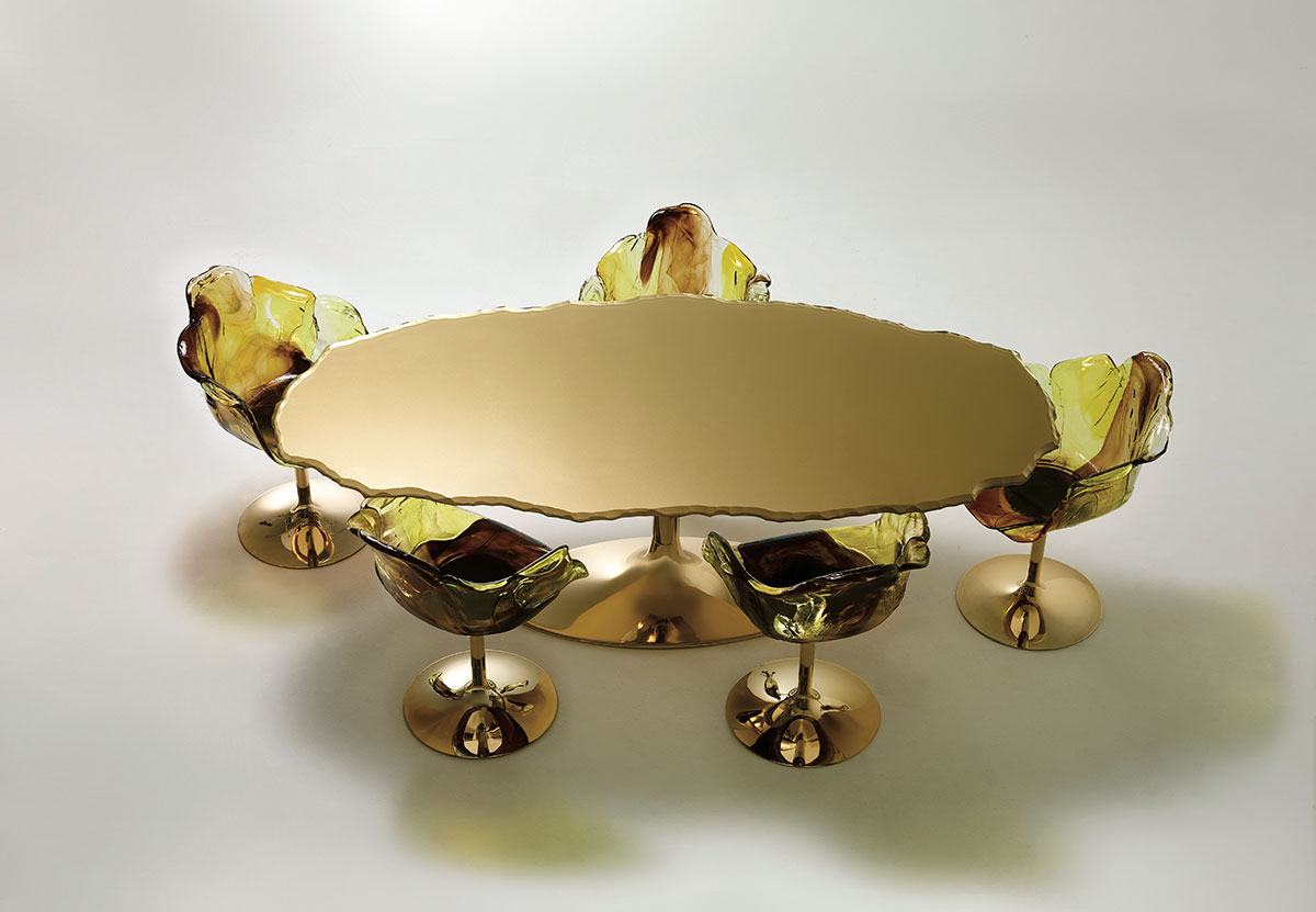 Blu Velvet (neu seit 2018) im Kontext mit dem neuen Tisch Egeo, ebenfalls von edra.Absolut elegant: Stuhl Ella und Tisch Egeo mit einem der schönsten Tischfüße der Saison: Ein oval geformter Trompetenfuß, in diesem Fall golden. Die Tischplatte ist aus gold hinterlackiertem Glas mit kunstvoll gebrochener Kante.