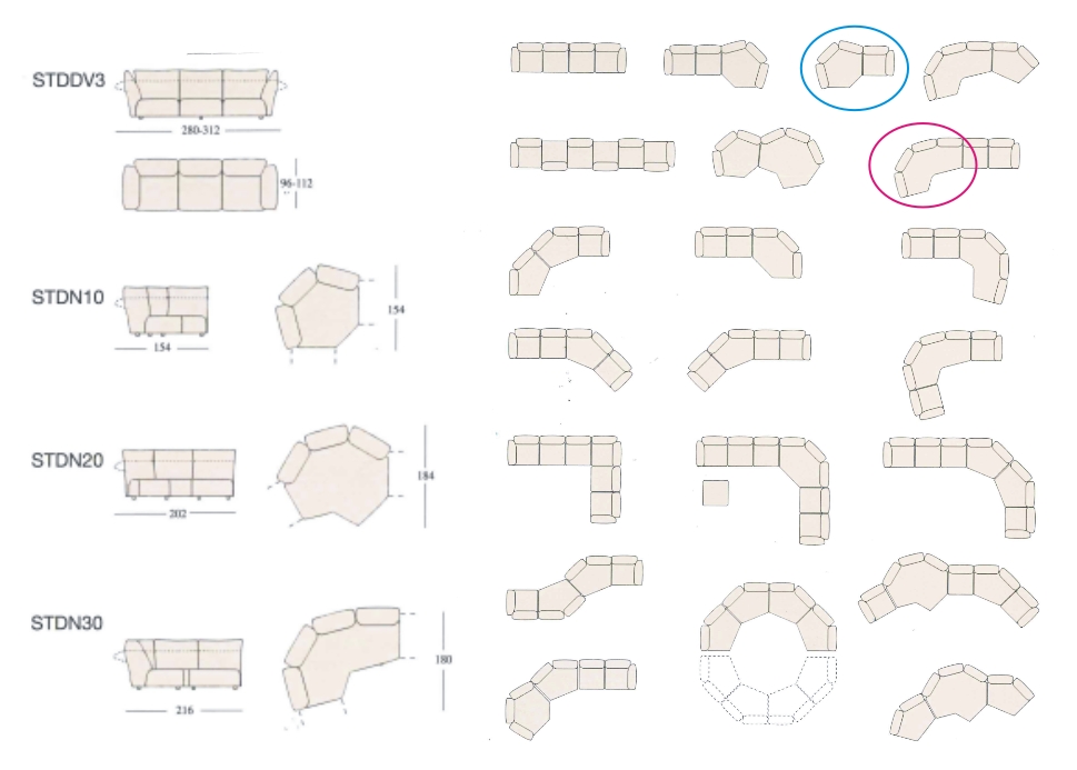 Sofa Standard mit seinen wunderbar eben nicht geradlinigen Elementen.Sofa Standard in der beliebten Wabenform, ein Mittelteil, ein Endteil….… macht auch von hinten eine gute Figur.