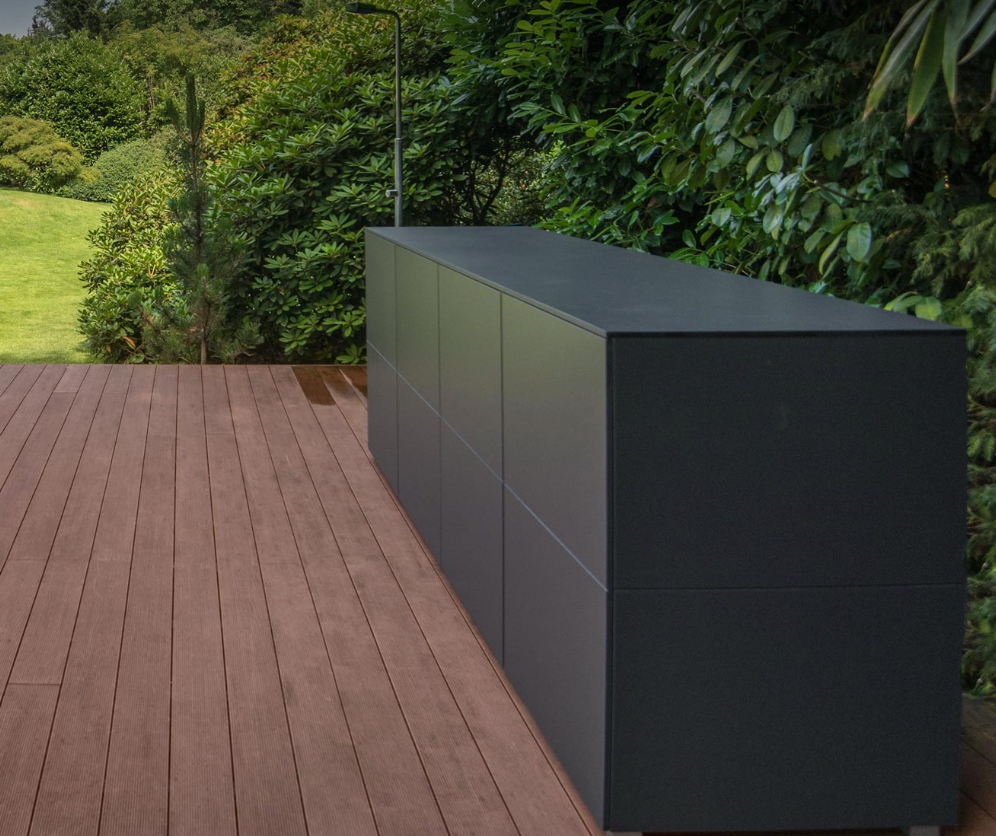 Wer träumt nicht davon? Aussenküche DROP von Caneline macht ihrem Namen alle Ehre: Ohne grossen Aufwand können Sie die komplett wetterfeste Küche einfach aussen aufstellen und mit einem Gartenwasseranschluss versehen. Ihr Innen- und Aussenleben ist aus Metall. Die Rückwand aus Teakholz kann, muss aber nicht dazugenommen werden.