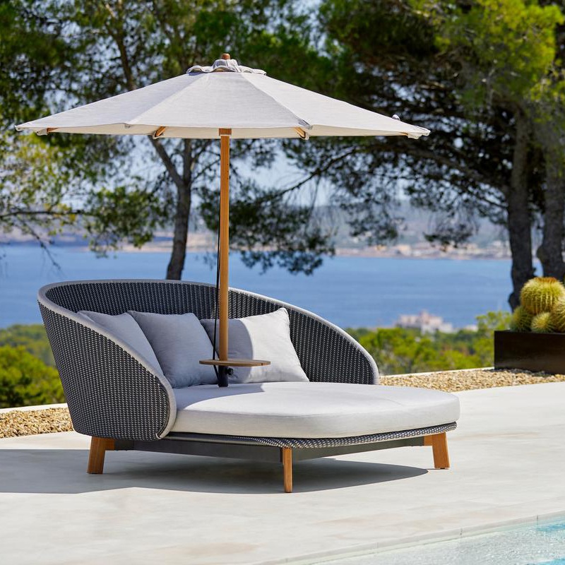 Mein absoluter Lieblingsplatz 2018 war der Aussensessel Peacock. Der hat nun 2019 eine wunderbare Ergänzung erfahren: Es gibt ihn jetzt auch als Doppelsitzer und als Daybed mit Schirm oder Tischchen, ausserdem als Esssessel.