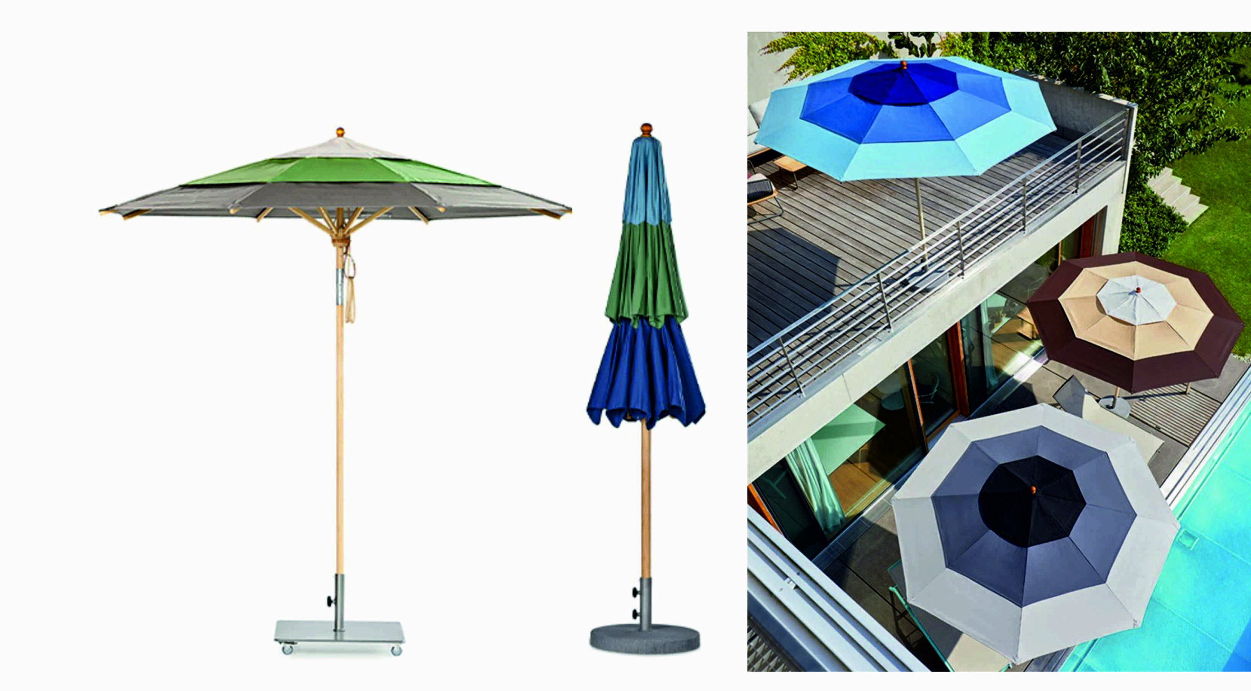 Für mich die schönste Art Sonnenschirme zu denken: Individuell ausgesuchte Farben auf echtem Teakgestell. Nun bei uns zu sehen: