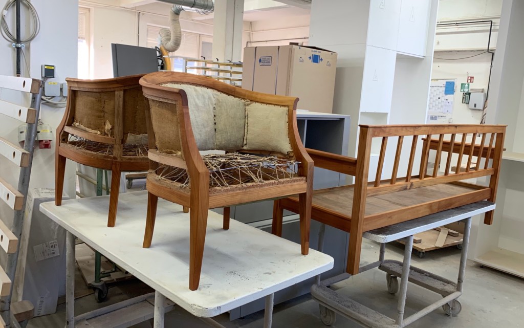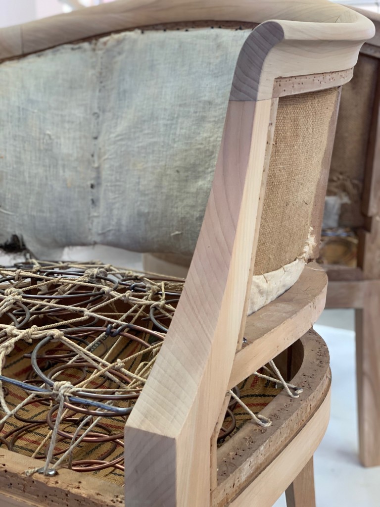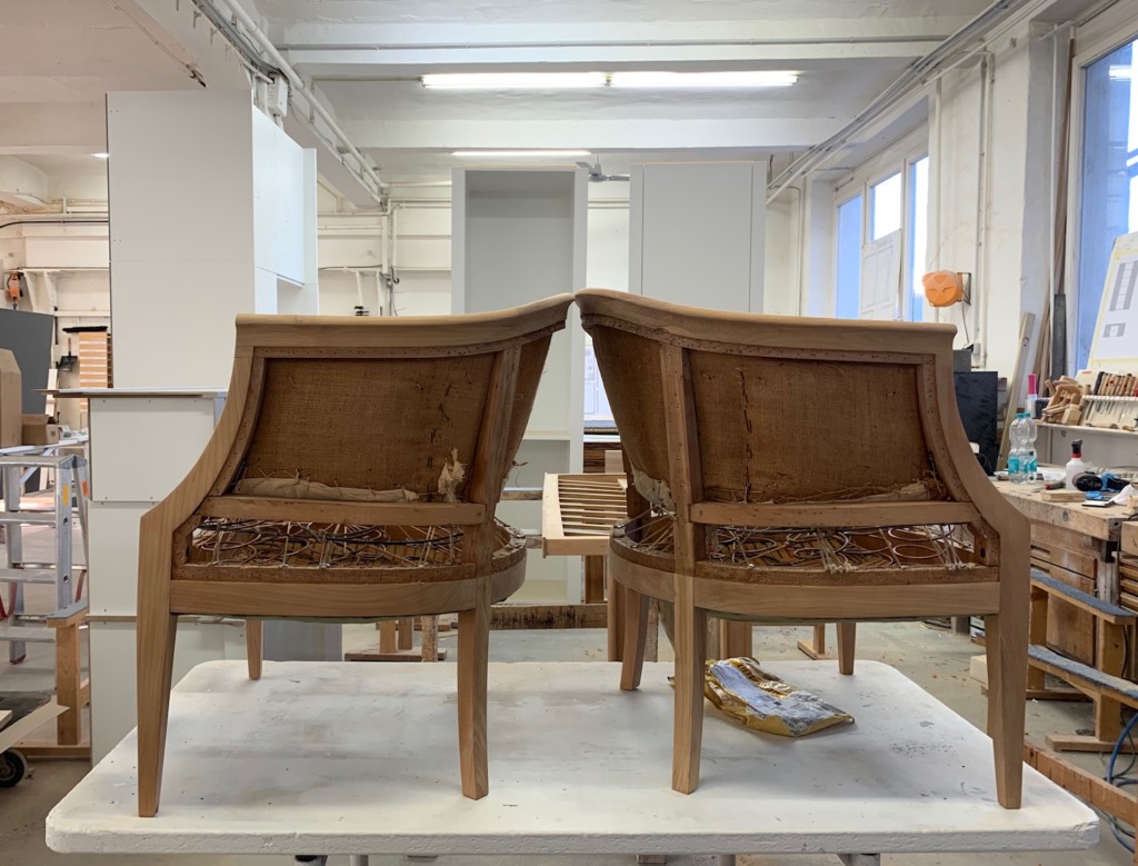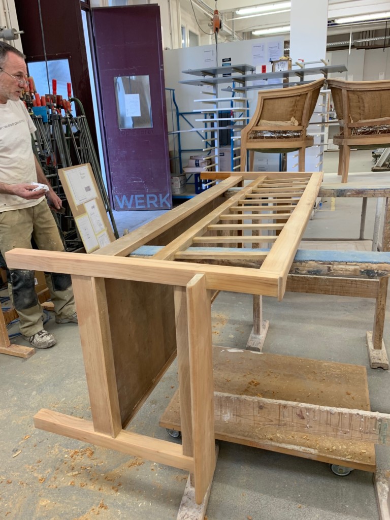 Eine schöne Geschichte darf ich hierzu weiter unten erzählen: Wir haben die Momente der jetzigen Krisenflaute genutzt, um 100 Jahre alte Sitzmöbel meines Urgroßvaters zu restaurieren. Diese hatte sein Schwager in Auftrag gegeben, um meinen Urgroßvater in der schwierigen Zeit der Währungskrise am Leben zu erhalten. Die Firmenstempel seines Kohlehandels an der Unterseite der Sitzflächen zeugen hiervon. Voller Hochachtung haben wir das Holz abgeschliffen, geölt, die Polsterung aufgearbeitet.