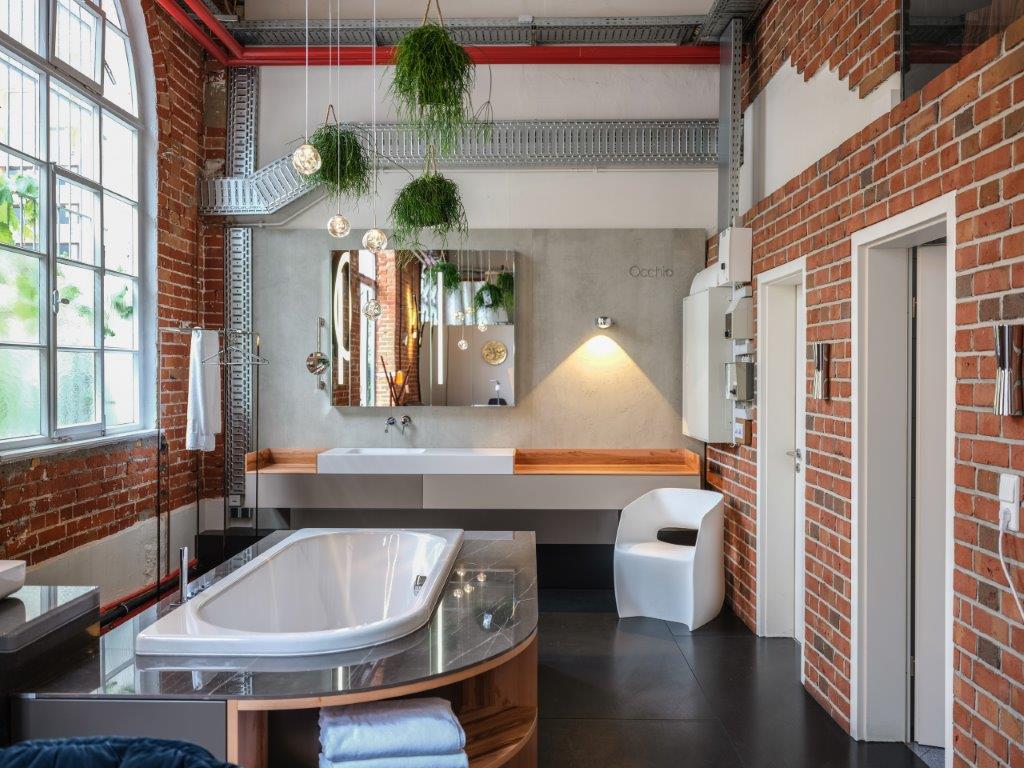 In unserer Backsteinhalle zeigen wir unser Können im Bereich Planung und Ausführung. Hier ein Badensemble mit Stahlemailwanne und Aufsatzwaschschüssel von Kaldewei, im Hintergrund ein Waschtisch mit Silestone-Kunststeinbecken und Schreinermöbel.