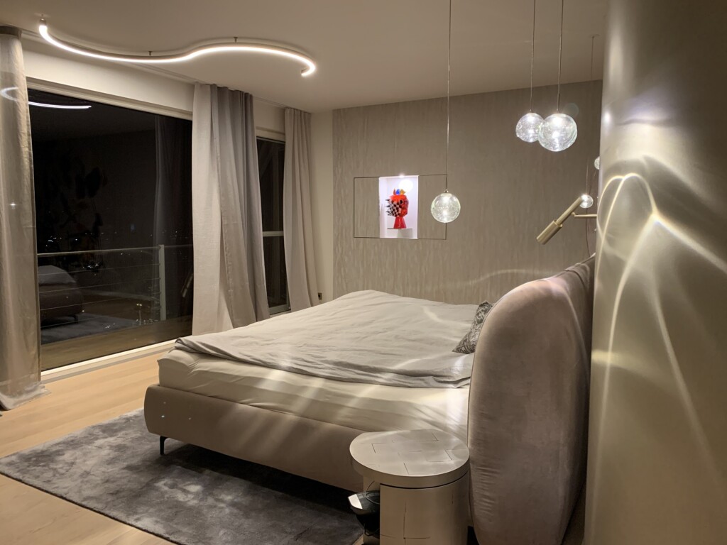 Schön, schöner am Schönsten. Vom Schlafbereich ziehen sich Blick wie Naturholzboden bis durch das Masterbad. Eine Wellnesswand aus mit Infrarotwärme beheiztem Marmor “Estremoz Super” aus Portugal gibt das Farbenspektrum vor: Kupferfarbener Lack an den Waschtischfronten, fugenlose Corianwaschtischplatte, handgeblasene Glaslichtkugeln, Textilien von Sahco und Creation Baumann und eine freistehende Badewanne, ebenfalls aus Corian. Die kupferfarbenen Armaturen aus Italien kommen erst noch…Der gigantische Aufwachblick nach Osten gleitet ungestört elegant durch die Glaswand zum Bad. Schlafzimmer und Badezimmer gehen ineinander über. Kein Problem, eher ein grosser Gewinn, ist ein Holzboden im Bad……der nur in der Dusche durch eine fugenlose Oberfläche ersetzt wird. Hinter der Duschwand schliesst die Toilette an, die durch das Oberlicht ebenfalls Tageslicht bekommt.Die sanften Farben werden im Schlafbereich weitergeführt: Gold, Rosè, Kupfer und echtes Platin. Das Bett ist Model Luno von Kettnaker, alle Einbaumöbel sind von uns. Mehr zum Thema Schlafen hier…Hier rechts im Bild: limitierte Kommode “Meisterstück” von Kettnaker platinvergoldet, passend dazu unsere in der Schreinerei gefertigten Nachtische, rund und ebenfalls platinvergoldet. Dazu die Schalter Serie Jung LS 1912 mit Kippschalter. Schöner gehts nimmer: Die Lichtstrahlen durch die mundgeblasenen Glaskugeln wirken wie ein Zauber.